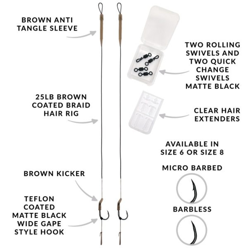 Teflon coated matt black wide gape hooks. 2 x 25lb camo brown coated braid hair rigs with brown kickers, brown anti-tangle sleeves and silicon tube. With small plastic box containing 2 x matt black size 8 rolling swivels and 2 x size 8 quick change swivels, and clear hair extenders.