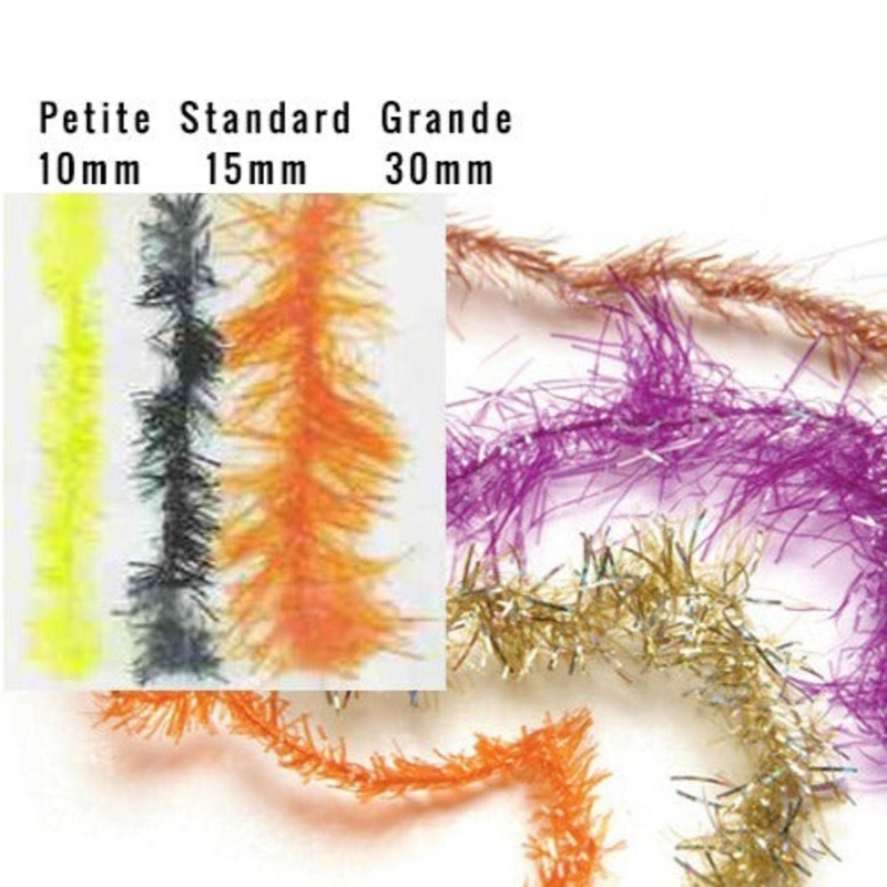 The best in flashy chenilles, with a very strong core wrapped Mylar strand with long fibers for an attractive flash. Easy to use, great for salmon, steelhead and saltwater patterns. Standard – Diameter is 15mm, length of material is 2.5 yd. in a package. Petite – Diameter is 10mm, length of material is 2.5 yd. in a package. Grande – Diameter is 30 mm and length of material is 1 yd. in a package.