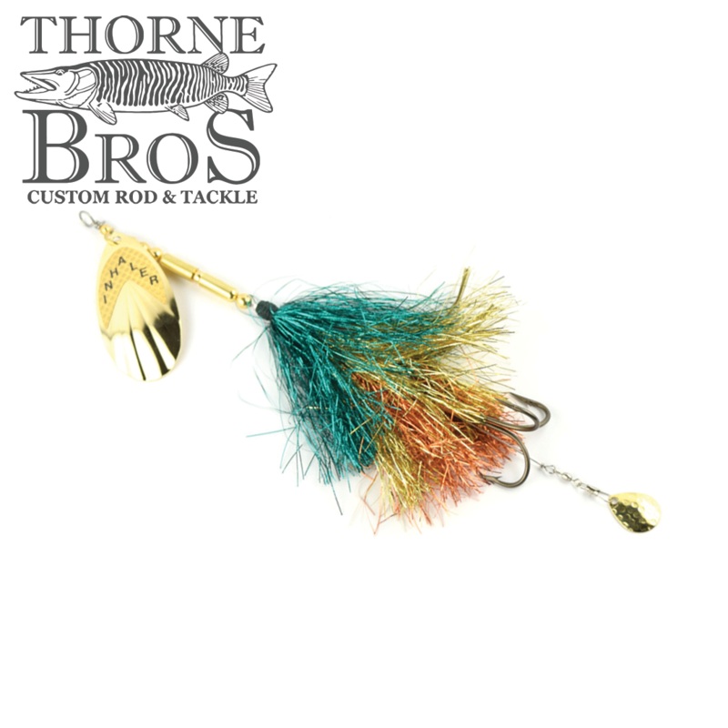The tinsel fibers on this bucktail sparkle like fireflies on a summer night. Tremendous reflection and flash show off from all angles and the #7 fluted blade make the tail absolutely dance. Tipped with a chaser tail this bait has all the attraction that makes muskies go nuts!