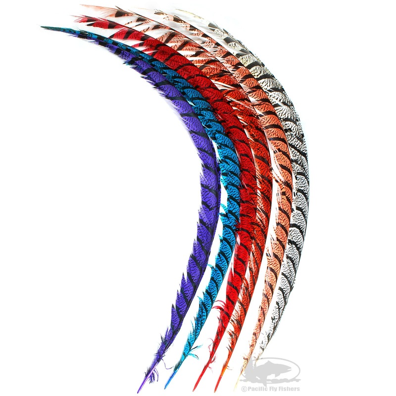 Beautiful Lady Amherst Pheasant full center tail feathers dyed to perfection. Includes one tail feather of approximately 36 inches in length. Each tail feather offers a ton of long barbs for tying popular steelhead and salmon flies like the Hoh Bo Spey. Get these while they are available. Supply can be limited and sporadic.