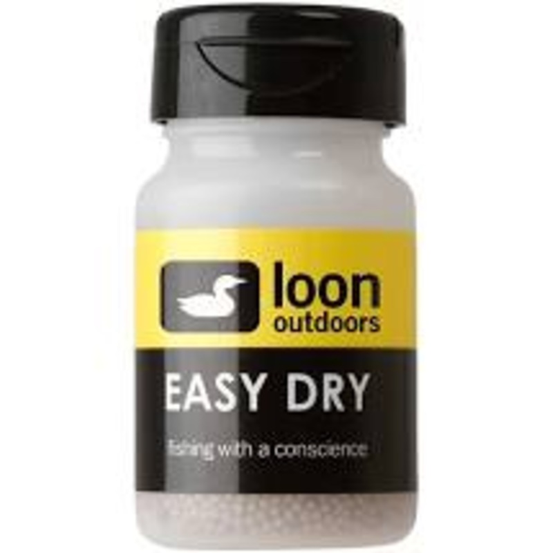 A treatment to revive flies composed of two things: drying beads and blue indicator crystals. A fly (still attached to the leader) is dry after a few quick shakes and ready for floatant. The blue indicator beads turn pink when the drying beads have become saturated and it is time to get a new bottle of Easy Dry.