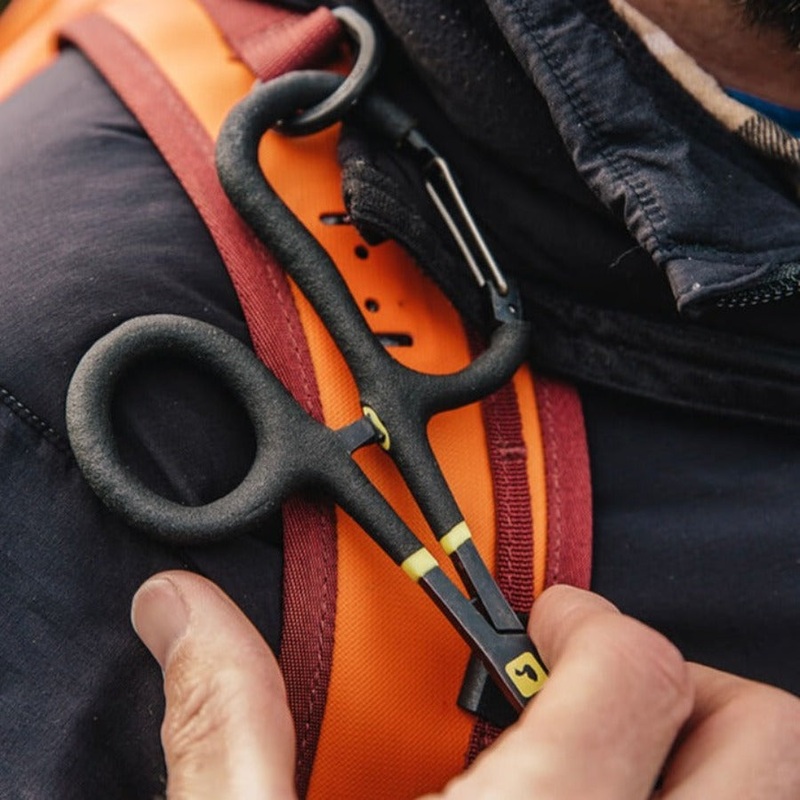 - Forceps are 6.25″ long with carabiner finger loop and flat geometric jaw for easy hook removal/de-barbing