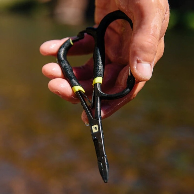 Loon Rogue Quickdraw Mitten Clamps are the ultimate mitten clamp, thoughtfully designed from the tips to the jaws to the handle. A carabiner handle means you can store anywhere and the tight angles and engineered shape accommodate all fly sizes, allow for easy hook removal, and can crimp even the heaviest of barbs. Oversized thumb and finger holes accommodate large or gloved hands, and the compact cutting surface easily clips light or heavy leader.