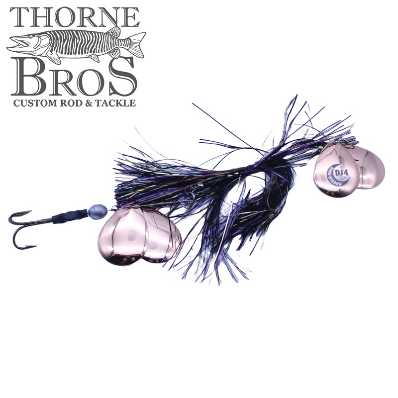 With the joint effort of Todd Schulz from Musky Moon Guide Service, his son and Musky Mayhem Tackle llc we bring you the new Mayhem Moon product line. A exciting brand new style of bucktail featuring a jointed wire system that creates a unique tail wiggle. The front blades vacuum up the skirts while the rear blades cause additional tail wiggle and fish attracting vibration. The DS4 has 4 #7 colorado blades and 2-4/0 treble hooks it weighs 2.4 oz and is 11.375 inches long