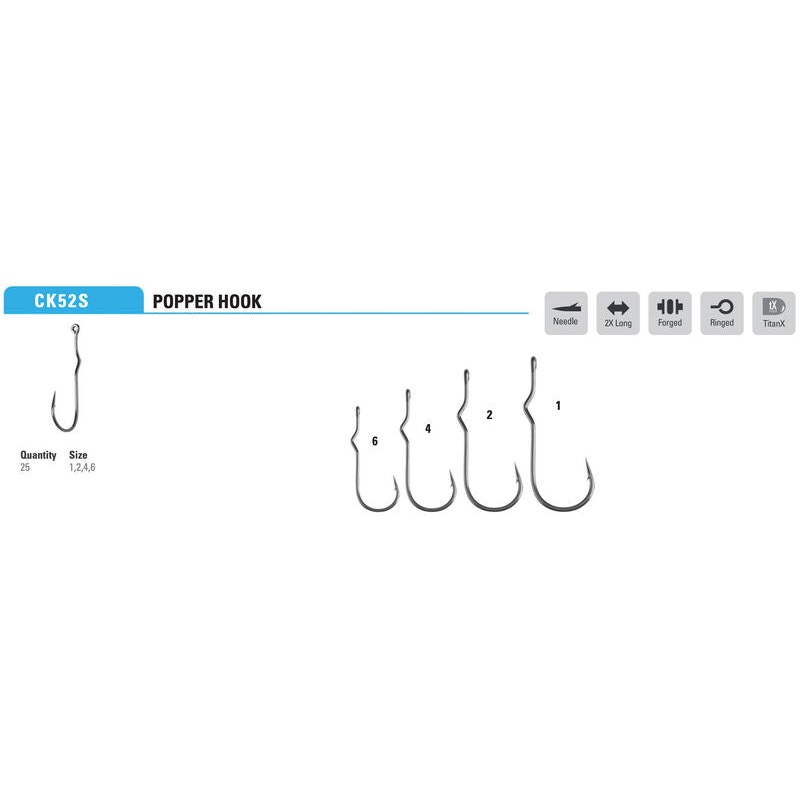 The CK52SAP is the classic popper hook with a curved bend, kinked shaft and straight eye. The kinked shaft ensures that your popper head stays in place. The perfect hook for all freshwater poppers, both small and large. Fitted with the new TitanX matte gun metal finish for reduced reflected glare and increased stealth.