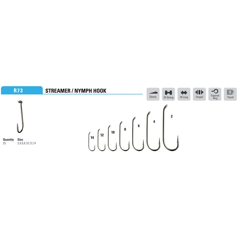The R73AP is the standard freshwater hook with a round bend and down eye. This is a 2X strong and 3X long hook. The R73AP is ideal for all streamers, lures and long shank nymphs. Fitted with the new TitanX matte gun metal finish for reduced reflected glare and increased stealth.