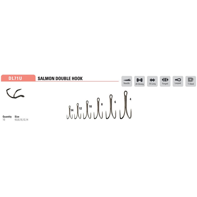 The DL71UAP is a 2X strong, 1X long looped up eye, forged, double salmon hook for both modern and traditional patterns. This Salmon Double Fly Hook comes equiped with Mustad’s Titan Steel finish, designed for a sleek look and extreme saltwater-resistance.