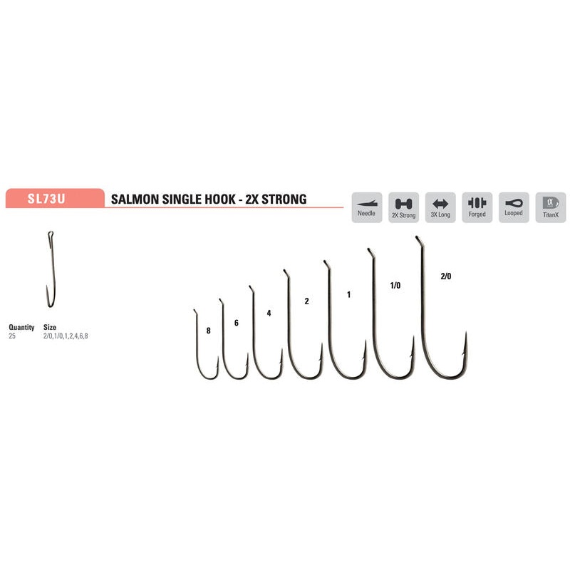 The SL73UAP is a 2X strong, 3X long, looped tapered up eye, forged, single salmon hook. The extra heavy wired shank has proved a favourite when a super strong hook is required, not only salmon but also for steelhead, and big sea run browns. For both modern and traditional patterns. Fitted with the new TitanX matte gun metal finish for reduced reflected glare and increased stealth.
