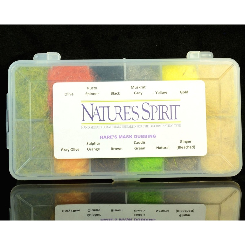 Nature’s SpiritHare’s MaskDubbing Dispenser includes 12 different dubbing colors including: Olive, Rusty Spinner, Black, Muskrat Gray, Yellow, Gold, Gray Olive, Sulphur Orange, Brown, Caddis Green, Natural, and Ginger (Bleached).