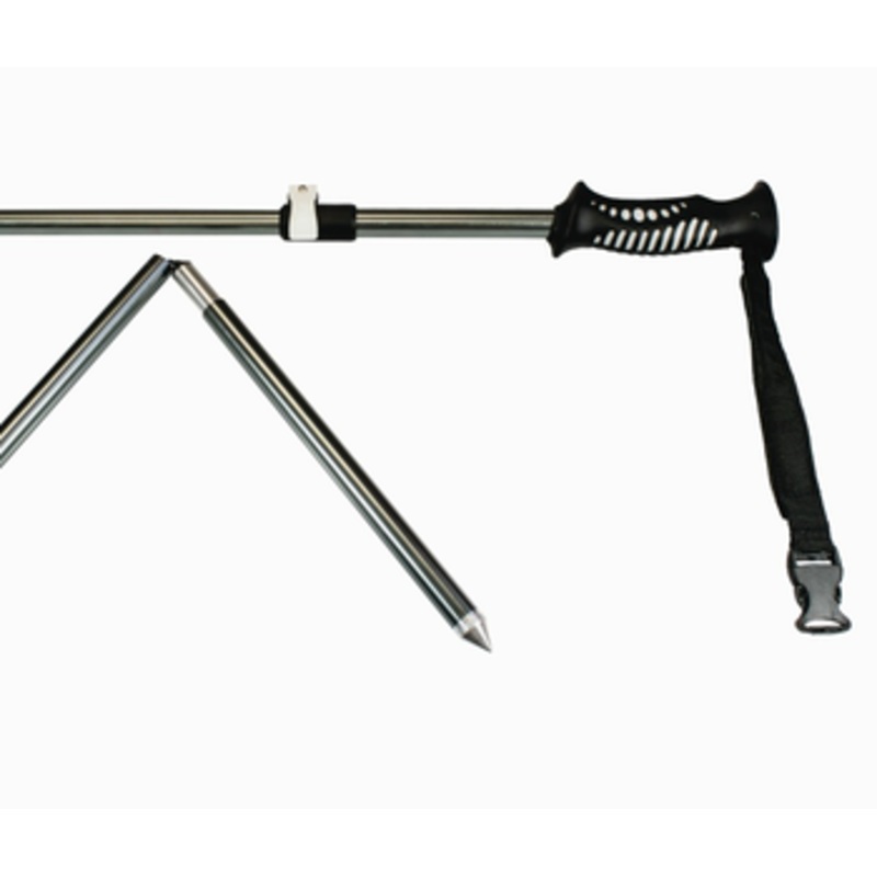Collapsible aluminum wading staff locks open with adjustable height from 49-54 inches. Includes belt sheath and wrist lanyard. Aluminum tip.
