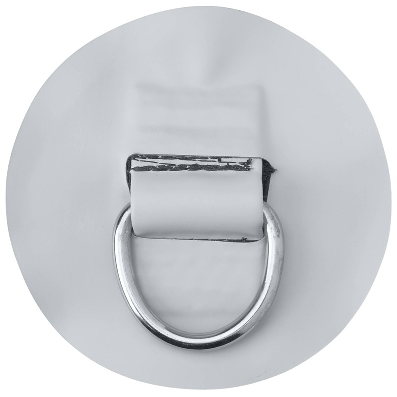 Two layers of nylon webbing secure the D-Ring to a 840 denier 42-oz. neoprene base. A strip of neoprene covers the nylon, protecting it from UV and abrasions. Colored Pennel Orca is glued on top to complete the patch. D-Rings are stainless steel, and available with 4.5, 6 or 8 patches. (8 patches are good for replacing D-Rings that have been removed because it covers the area of the old patch.)