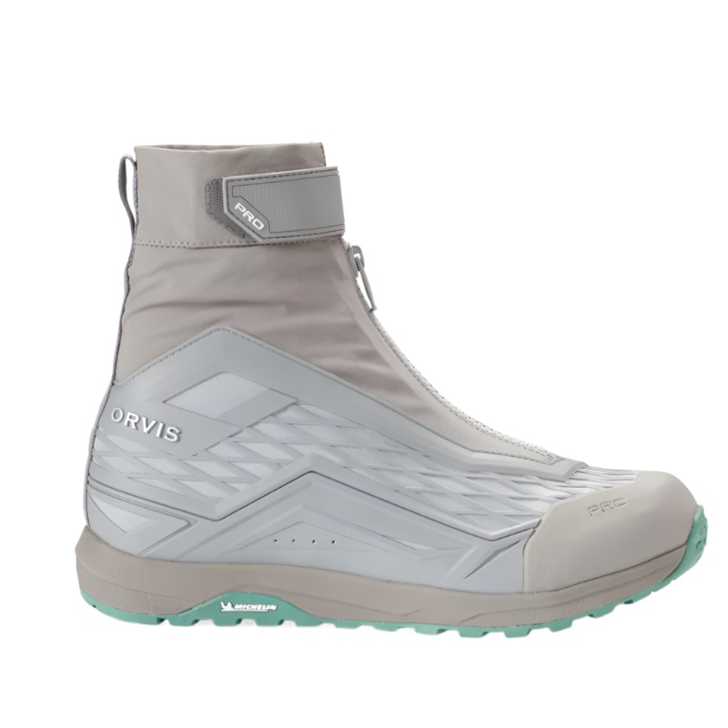 The ultimate wet-wade boot and made to cover miles, our popular PRO Approach Shoe morphs into a salt-perfect hiker specifically designed for the rigors of the marine theatre. The PRO Approach Hiker for saltwater offers generous ankle support required to explore endless flats, jetties, and mangrove muck quickly and safely. Its built with an Intuition-based foam footbed that molds around your foot for a custom fit unlike any other wet-wading shoe ever designed. Featuring the same exclusive Michelin outsole as our PRO Wading boots, these saltwater hikers feature superior wet and dry traction in the boat, and on rocks and notoriously slick docks with a massive bonus: The teal outsole wont scuff and mark up boat decks. PU cast exterior with a scratch rubber toe for next-level abrasion resistance. The built-in, improved zippered gravel guard with hook-and-loop closures and lace-up interior gives you the best fit possible, and makes a separate set of wading socks unnecessary unless youre battling cooler water temperatures. An EVA midsole with soft liner protects against hot spots. Easy-grab heel loops on lace cover and liner heel help you suit up and get to the water quickly.