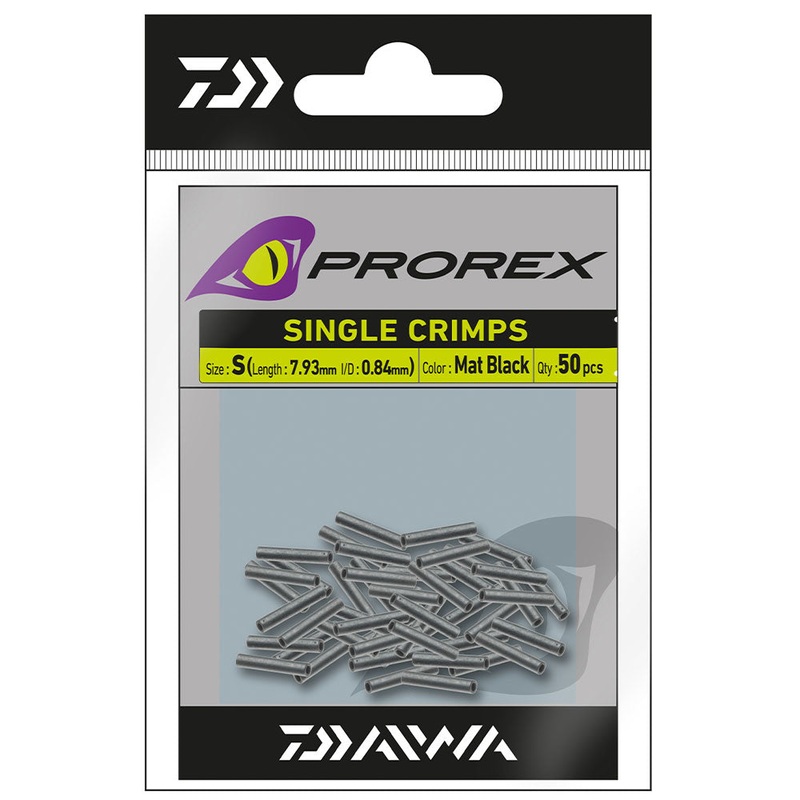Die Daiwa Prorex Single Crimps sind in 4 Gren verfgbare, hochwertige Klemmhlsen fr Stahl, Hardmono und Fluorocarbon. Sie sind aus dickwandigen Messing, welches einerseits sehr gut hlt, andererseits aber weich genug ist, um sich gut knicken zu lassen, ohne das Vorfachmaterial zu beschdigen. Die mattschwarze Beschichtung sorgt dafr, dass Lichtstrahlen unter Wasser nicht reflektiert werden. Dadurch ist das Vorfach unaufflliger und vorsichtige Raubfische werden nicht verschreckt. Egal, ob du dir Stinger, Rigs oder komplette Vorfcher machen willst, mit den Daiwa Prorex Single Crimps bist du sehr gut beraten.