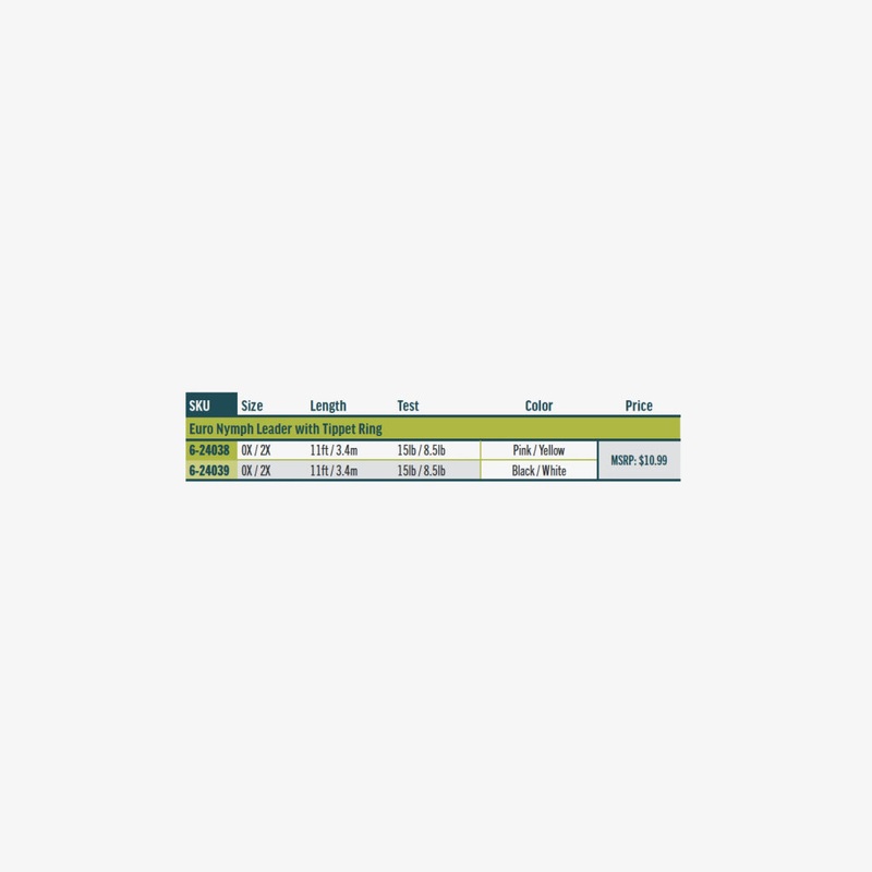 RIO’S Euro Nymph Leader is a uniquely designed tapered leader, and ideal for European nymphing techniques. The leader starts with 9′ of a milky-white tapered nylon for visibility, which is then attached to 22″ of RIO’s 2X, two-tone Indicator Tippet material, for maximum visibility in all light conditions, and to make subtle strike detection easier. The leader ends with a tippet ring, allowing anglers to attach their own tippet to match the water type and conditions.A uniquely designed, tapered leader – perfect for European nymphing methods.