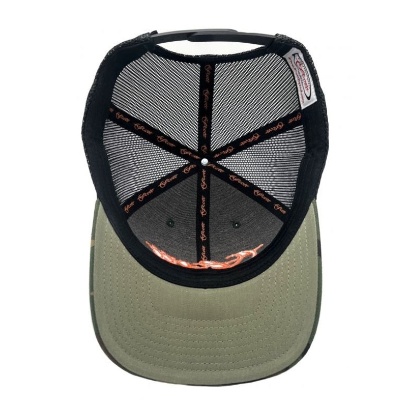Richardson Camo mesh snapback with an orange Scott script on the front