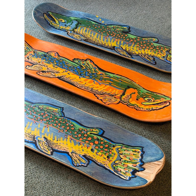 Original Jacob Lutz “Pop Art” inspired Cutthroat Trout, hand illustrated with oil paints on re-purposed skateboard decks. The entire decks have been finely finished in archival, non glare, clear coat for preservation, and a beautiful sheen.