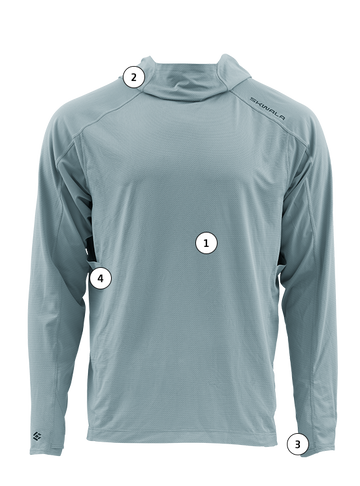 No distractions.Nice weatherisn’talways nice to fish in.Ahalo of mosquitoscircling your head,askeinof sandfliescoating your hands,fierymiddaysunscorching your skinsummerydayscandemand just as much protection as rainy or snowy ones.Thatswhy we built theSol Defense Hoody.Breathable,high–stretchknit fabricprovidesa light and airy feel with full50+ UPF sun protection.Permethrintreated corefibersrepelbiting insects.Staycool, comfortable, and fully protectedfrom sun-damage and bug bites, so you can focus onfishing.